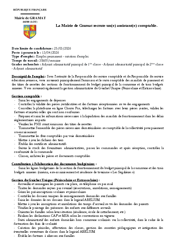 Retrouvez sur cette page les offres d'emploi à pourvoir au sein de la Mairie de Gramat.